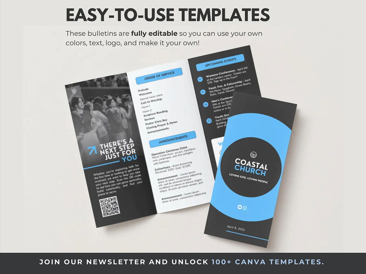 Easily personalize this Church Bulletin Template, then print and fold! Create a FREE Canva account and update your bulletin week after week with unlimited downloads.